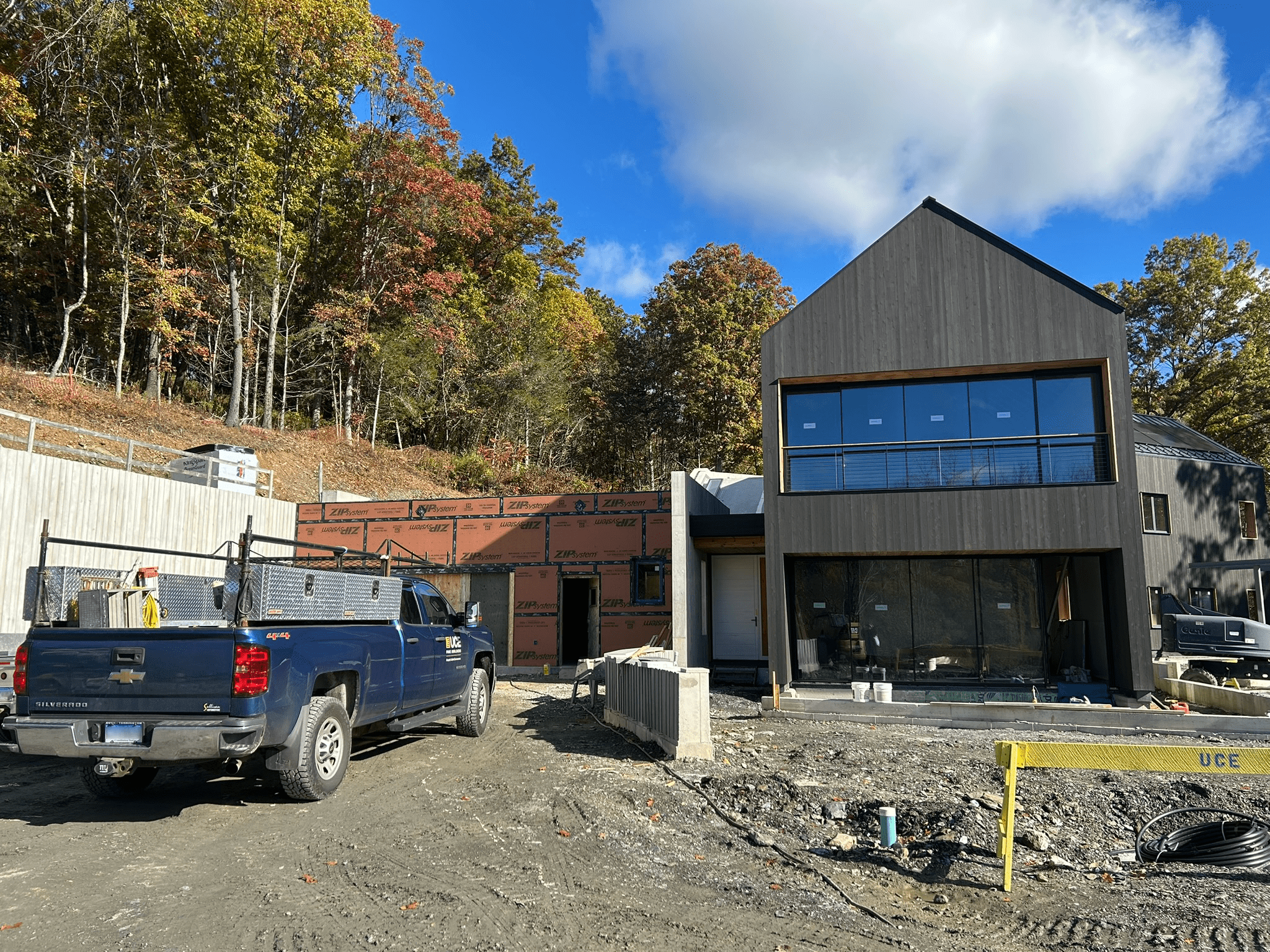 Construction continues on our Dutchess County House and Artist Studio, with several key milestones now taking shape on site. Shou sugi ban wood siding, installed last Fall and scheduled thermally modified wood siding at the garage facade complements the board-formed retaining walls throughout the exterior of the site. Progress on the green roof is underway, marking a significant step in integrating the architecture with its forested hillside setting.