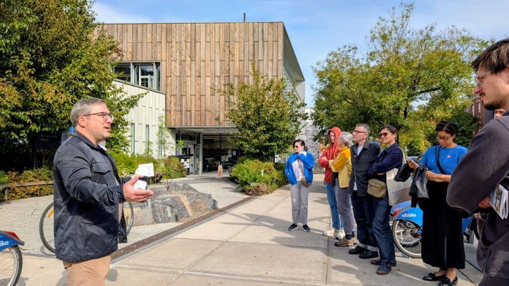At Greenpoint Library, Project Manager and Architect Jason Roberts guided visitors through a tour of the branch’s sustainable design strategies and community-driven spaces. From the ground-level bioswale to the rooftop pollinator garden, guests discovered how the building integrates landscapes at every level to support local ecology and environmental education. Jason shared how the project grew from deep community engagement and has become a vital hub for activism, learning, and social infrastructure in New York City.