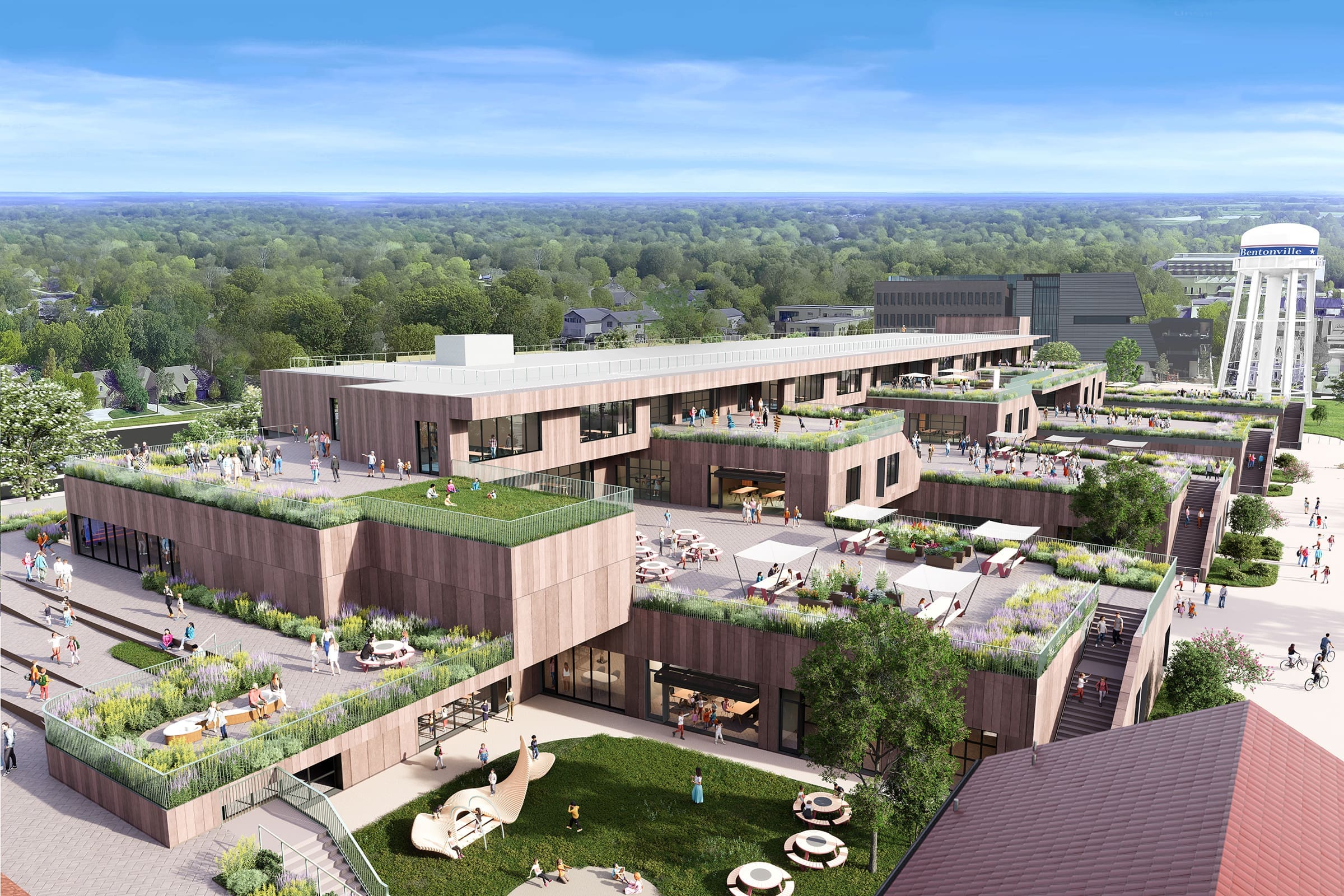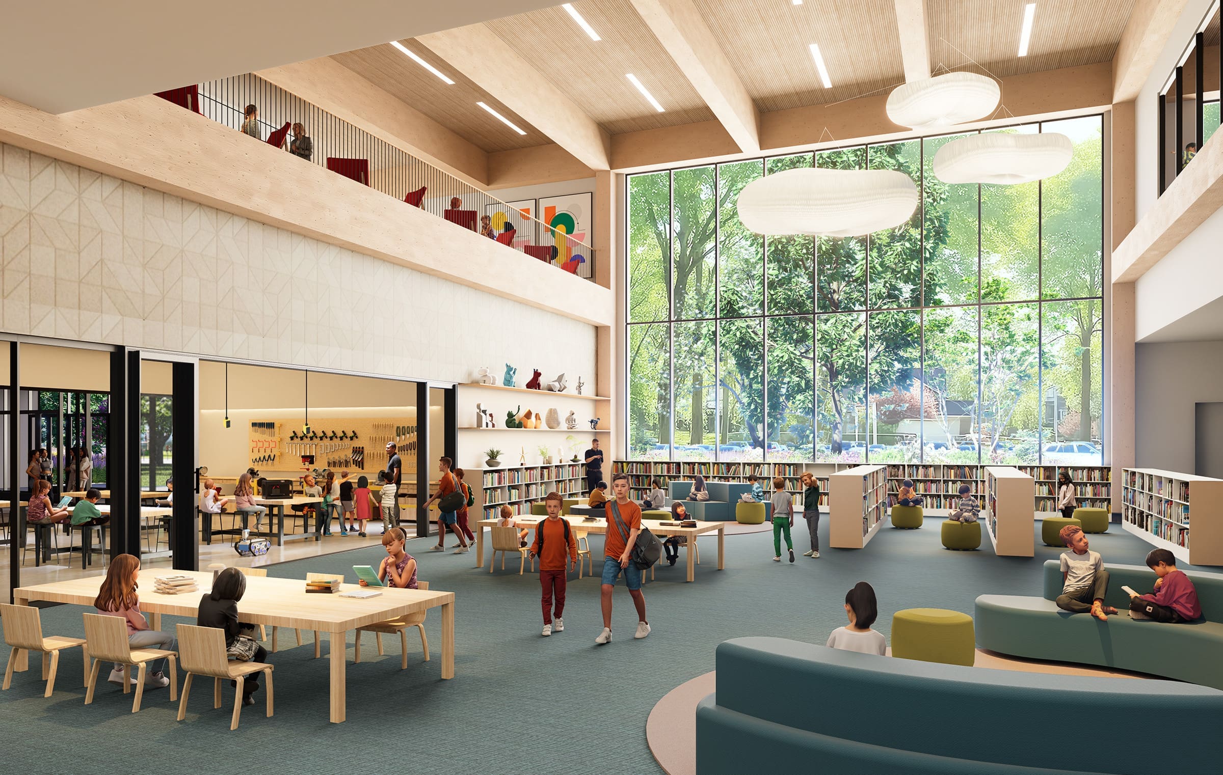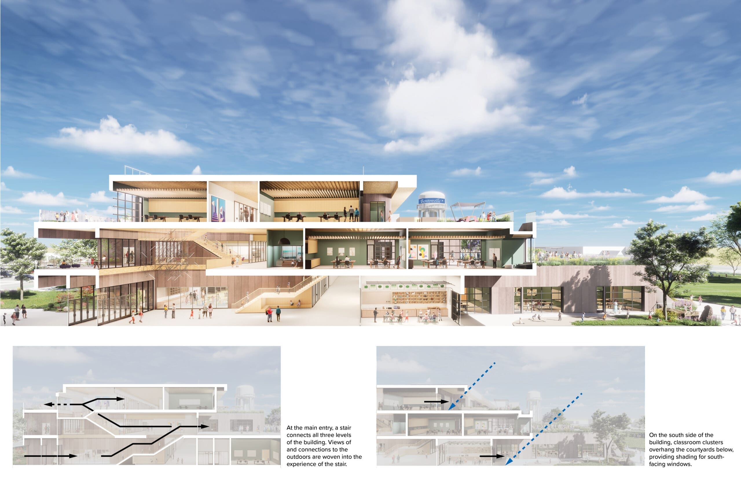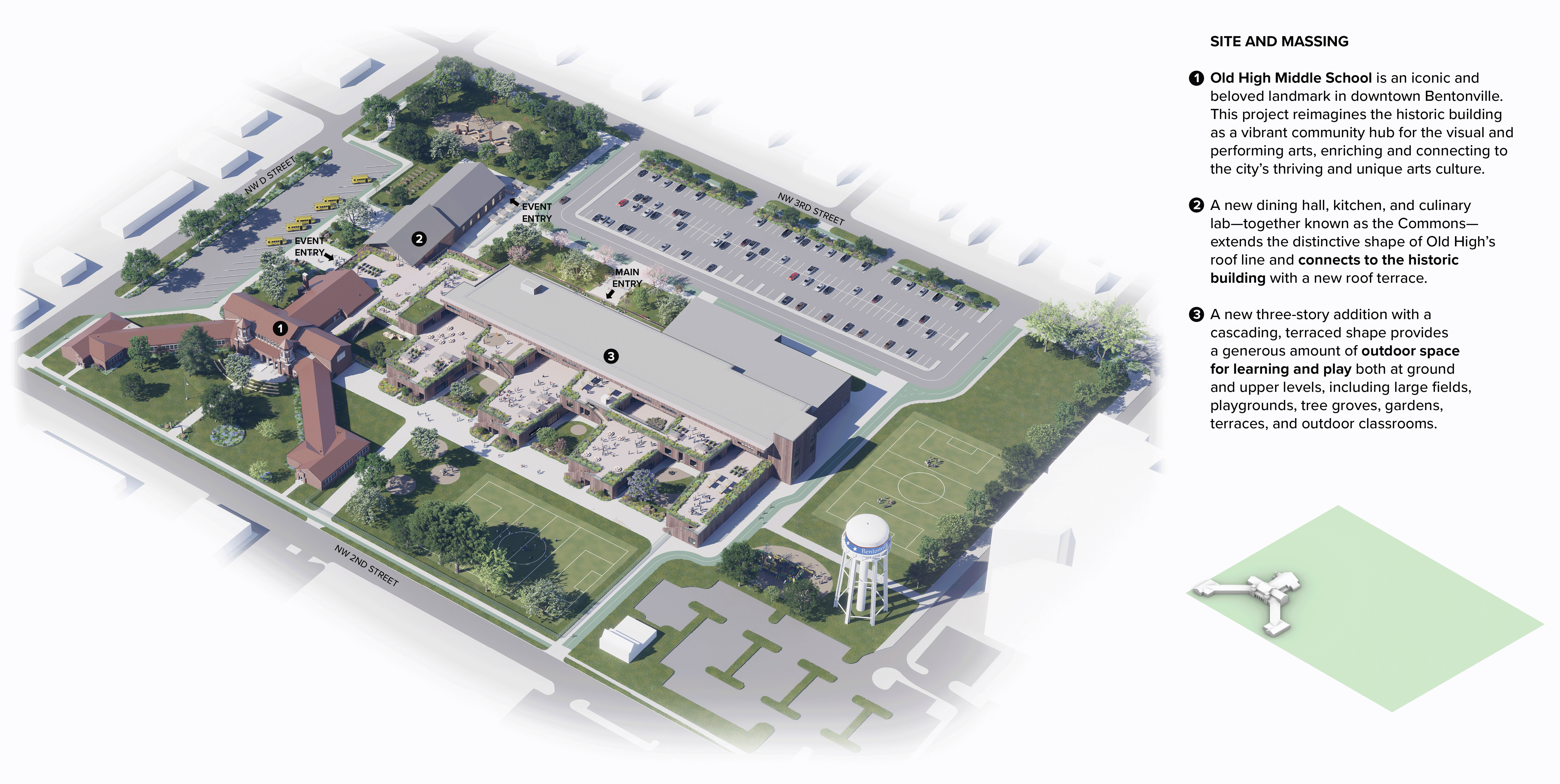 The project transforms a 15-acre site in the heart of downtown Bentonville into a K-6 school that reflects the city’s innovative and community-centered spirit. From the existing Old High Middle School building stems a new three-story addition with a cascading shape, providing a generous amount of outdoor space for learning and play, both at ground and upper levels, including fields, playgrounds, gardens, terraces, and outdoor classrooms. The material palette features the warm tones of local Ozark stone and a mass timber structure.