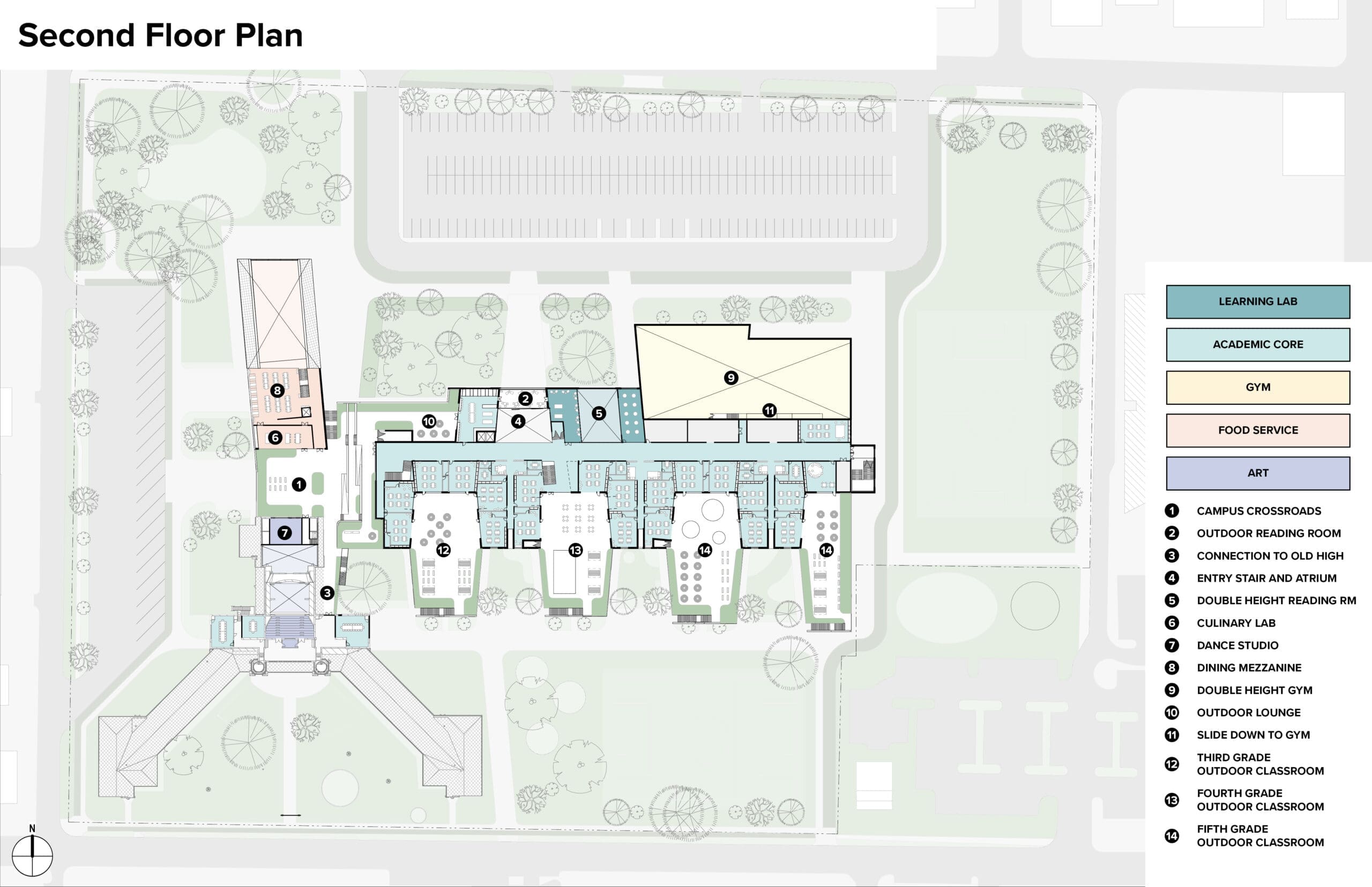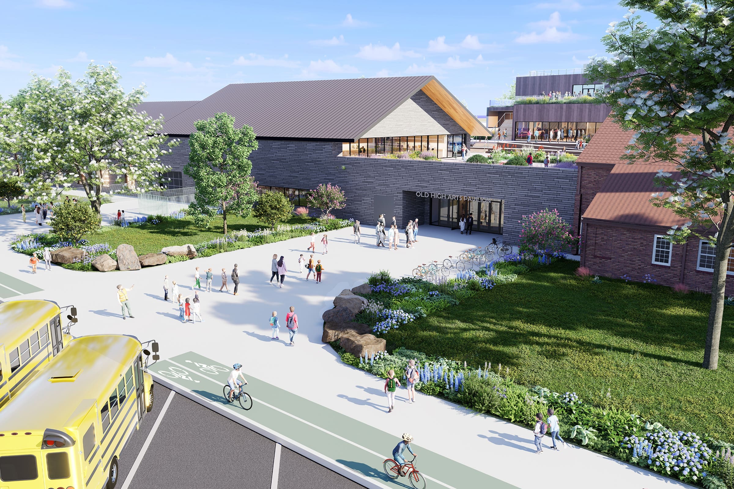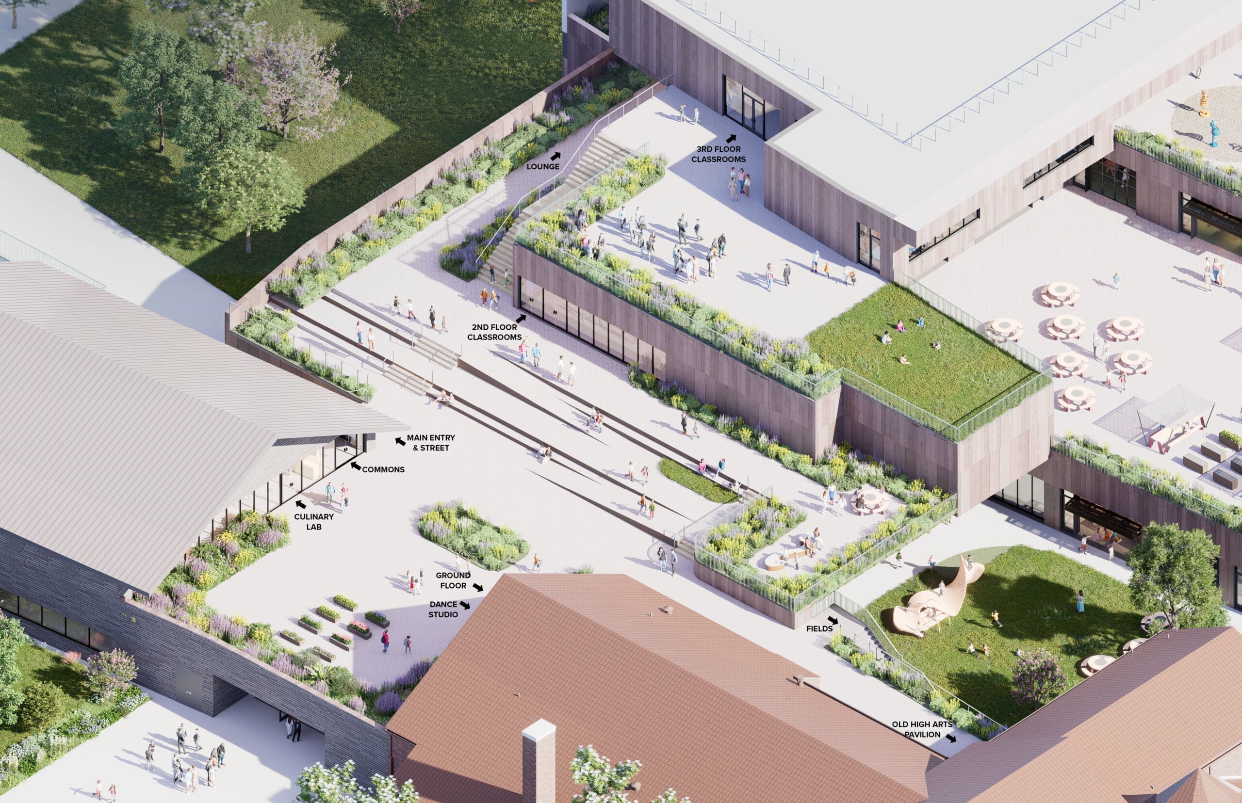 A network of anchor spaces support learning, movement, and community across the campus. The Learning Lab reflects the school’s culture of inquiry and creativity; The Commons and culinary test kitchen extend this spirit through projects centered on growing, cooking, and understanding food systems, wellness, and community health. The Gymnasium celebrates movement, play, and physical well-being as essential parts of learning. At the heart of the campus, the historic Old High is reimagined as the Old High Arts Pavilion for Performing and Visual Arts, linking past and future through music, art, and performance. These spaces not only foster student learning and gathering but also invite partnerships with the broader community—reinforcing the school’s identity as both an educational environment and a civic resource.