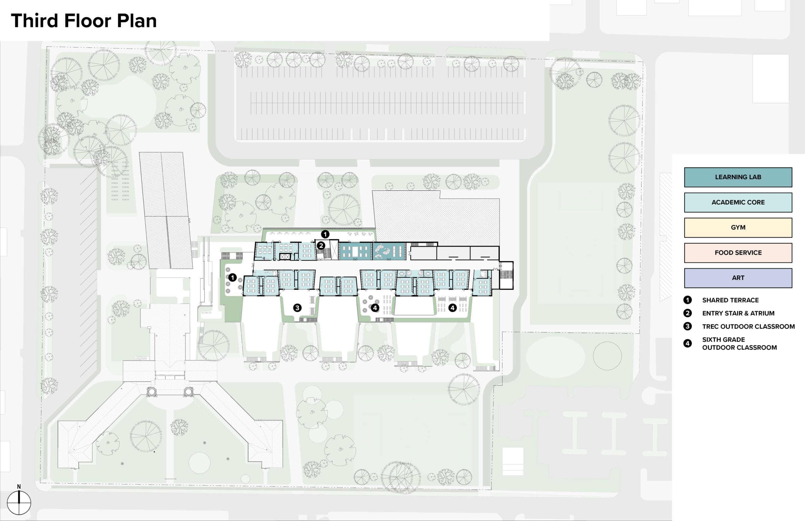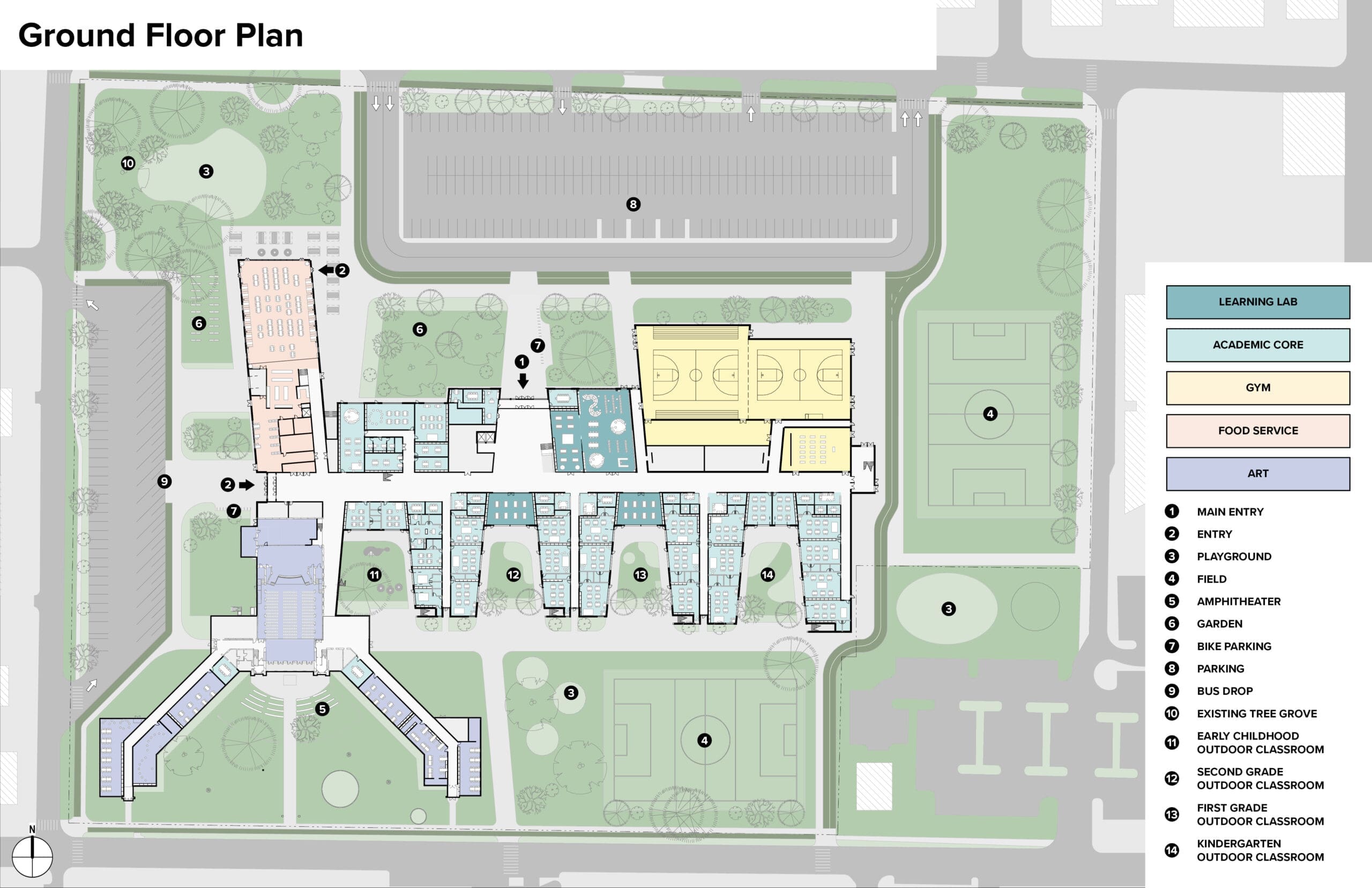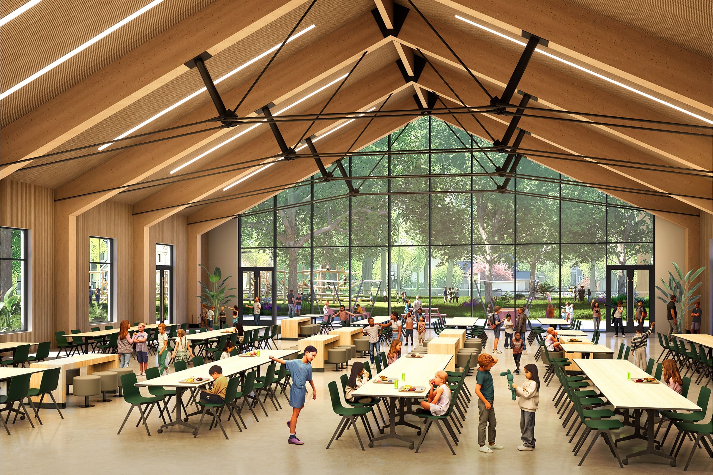 A network of anchor spaces support learning, movement, and community across the campus. The Learning Lab reflects the school’s culture of inquiry and creativity; The Commons and culinary test kitchen extend this spirit through projects centered on growing, cooking, and understanding food systems, wellness, and community health. The Gymnasium celebrates movement, play, and physical well-being as essential parts of learning. At the heart of the campus, the historic Old High is reimagined as the Old High Arts Pavilion for Performing and Visual Arts, linking past and future through music, art, and performance. These spaces not only foster student learning and gathering but also invite partnerships with the broader community—reinforcing the school’s identity as both an educational environment and a civic resource.